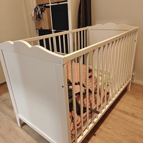 Kohtuullisen hyväkuntoinen vauvan/taaperon makuusija. Pienet hampaat nakertaneet paikoin kaiteen yläreunan maalipinnan rikki, aiemman omistajan maalaamista laatikoiden vetolaatikoista maali hilseillyt vähän irti. Muuten täysin ehjä.