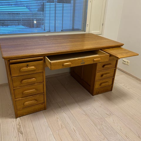 Billnäs kirjoituspöytä kunnostettu 90 luvulla, mutta ollu monta vuotta asunnossa, jossa on tupakoitu sisällä. Parissa laatikossa pinttynyttä likaa, mutta muuten hyvässä kunnossa. Pesulla ja lakkauksella saisi varmasti tunkkasen hajunkin pois. Mukaan saa vanhan/retro tuolin.