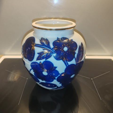 Vuonna 1983 käsinmaatut ja kultakoristellut kaksi uniikkia maljakkoa ja kynttilänjalkaa.