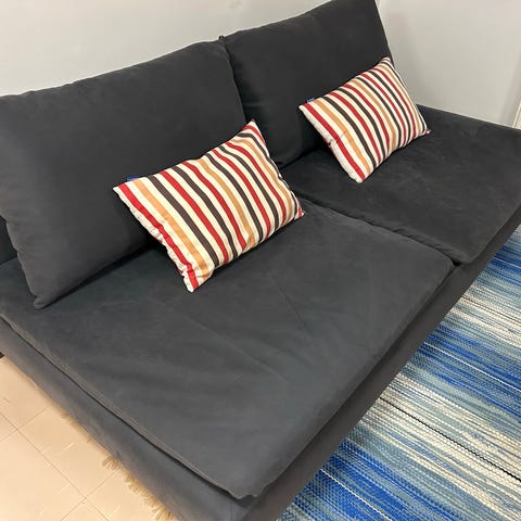 Sininen 3:n istuttava Söderham-sohva. Päälliset ovat irrotettavia ja pestäviä. Pientä kulumaa alareunassa ja sivussa ja pieniä käytön jälkiä, kuvista saa hyvin käsityksen kunnosta. Vain yksi selkänojatyyny, tilalla käytetty kuvan mukaista kokoelmaa muita koristetyynyjä, jotka saa halutessaan kaikki mukaan.