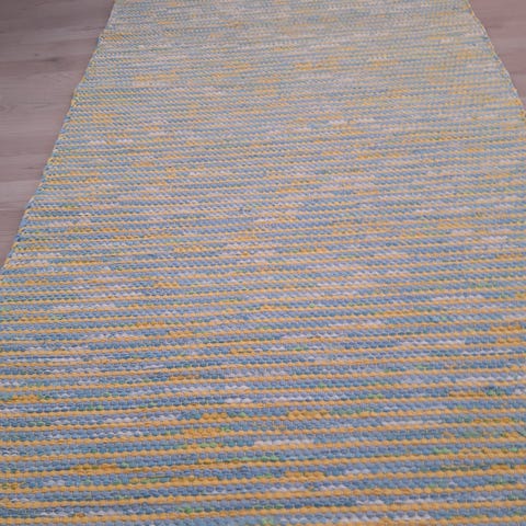 Pitkä uusi raidallinen räsymatto, jossa on erilaisia harmaan, valkoisen ja vihreän sävyjä. Materiaali puuvillaa, pussilakanaa ja Lankavan kierrätyskudetta. Koko 330 cm x 74 cm + 6 cm hapsut. Soveltuu käytettäväksi lattialla kodin eri tiloissa.
