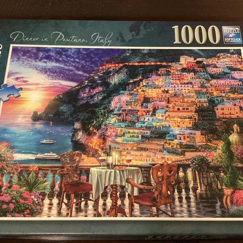 Ravensburger Puzzle, jossa on 1000 palasta. Palapelin kuva esittää kaupunkimaisemaa, jossa näkyy katu, rakennuksia ja ulkokahvila. Sopii aikuisille ja nuorille, jotka haluavat koota yksityiskohtaisen palapelin.