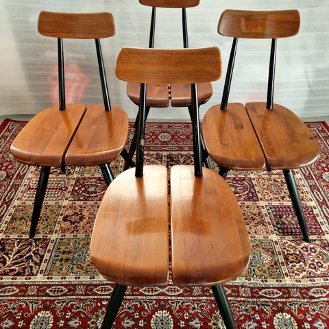 Kaksi Tapiovaara suunnittelemaa Pirkka tuolia. Aidot ja alkuperäiset, kunnostetut.