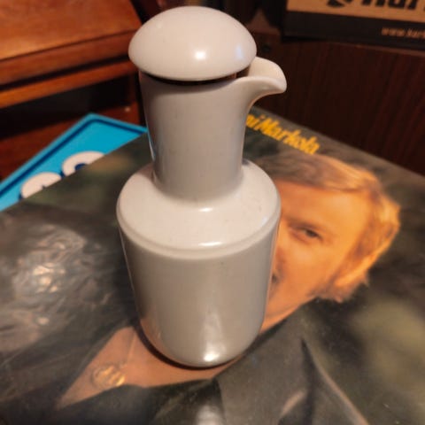 Arabia Saimaa pannu on valmistettu valkoisesta posliinista. Se on suunniteltu kahvin tarjoiluun ja siinä on kansi. Kahvipannussa on siniset koristelinjat kannessa ja rungossa. Valmistettu Suomessa.