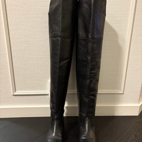 Bianco. Ylipolven ((täys)nahkasaappaat, varret voi kääntää. Mustat. Kokomerkintä 38, sisämitta 25cm ja mitattu 39 koon pohjallisella. Varren kokonaispituus kannan yläreunasta varren suuaukkoon n.60 cm, kääntöosuus n. 14cm, uuaukko n. 38cm kun taitettuna, yli polven toki paljon reilumpi kun takana siis tuo aukko, vetoketju n.32cm sivussa, korko 4.5cm. Muutamia kertoja vain pidetyt. Ei sovituksia, ei toridiiliä, en tingi, en kuvaa jalassa, en "esittele". Omaa laatikkoa ei valitettavasti tallella. Nouto tarkka aika etukäteen sovitusti ma-pe kl.10-16 Hki 88 tai postitse pakettina. Lisäkuvia/infoa saa aina pyynnöstä.