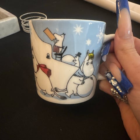 Arabia Muumi muki, jossa talvi-aiheinen kuvitus. Posliinimateriaali, väriltään valkoinen sinisellä ja monivärisillä yksityiskohdilla.