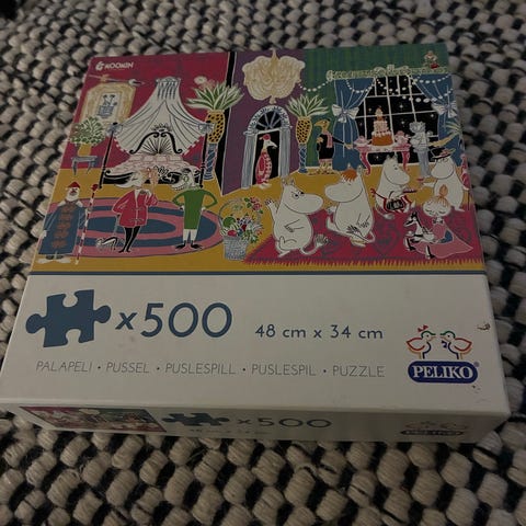 Peliko Muumilaakso palapeli, jossa on 1000 palaa. Palapelin koko on 68 x 48 cm. Kuvituksena on Muumilaakson hahmoja eri väreissä. Kerran koottu ja kaikki palat tallessa.