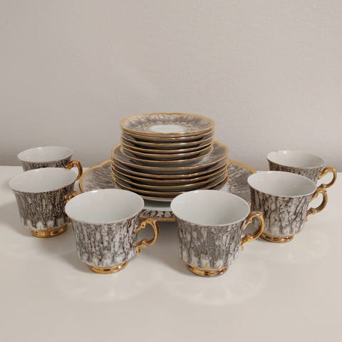 Kaunis uniikki v. 1982 käsin maalattu ja kultakoristeltu kahvikalusto. 6 kuppia, lautasta sekä tarjoilulautanen.