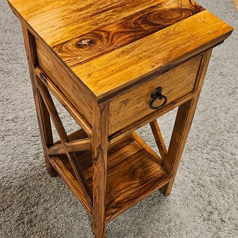 Valkoinen sivupöytä. Toinen laatikko aukeaa huonommin. Pinta käytössä hieman kulunut alatasolla. Muuten ihan toimiva ja nätti.