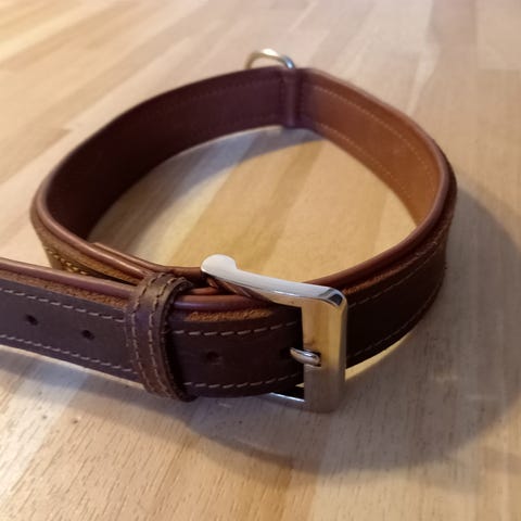 Nahkapanta. Lisä reikiä tehty. Käyttökelpoinen vielä. Ollut aikuisella kultainen noutajalla. Pituus 66cm