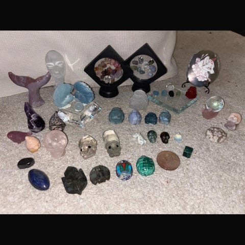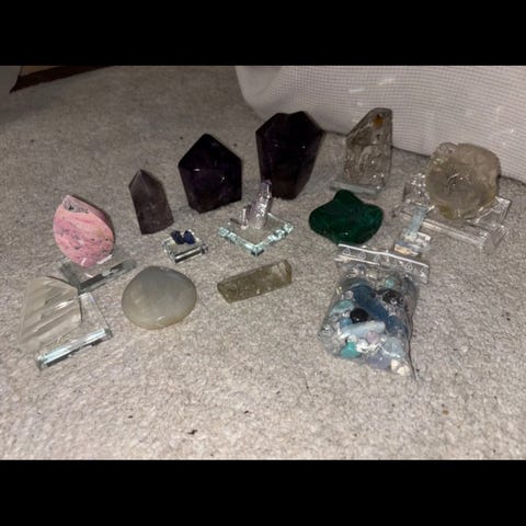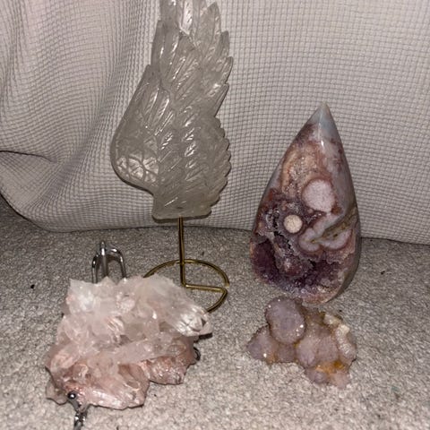 Belomoriitti, snowflake ruusukvartsi, kimmeltävä laventelifluoriitti, gardenkvartseja, enhydro garden kvartsi, dream ametisti, kunziitti, silver gold sekä rainbow obsidiaani, kultarutiili, peach moonstone, arusha sunstone.