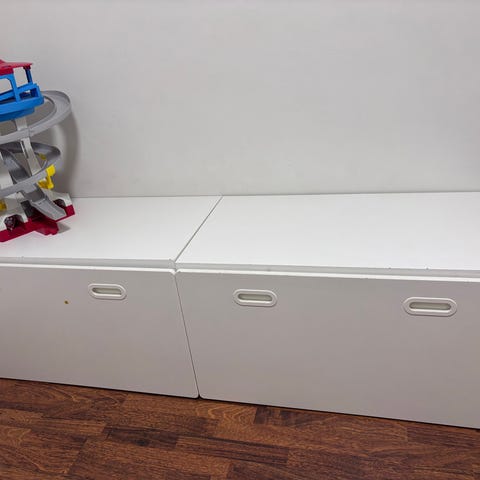 IKEA lastenhuoneen säilytyskaappi, jossa on useita värillisiä muovilaatikoita. Kaappi on valmistettu valkoiseksi maalatusta materiaalista ja suunniteltu lastenhuoneeseen tarjoamaan järjestystä ja säilytystilaa.