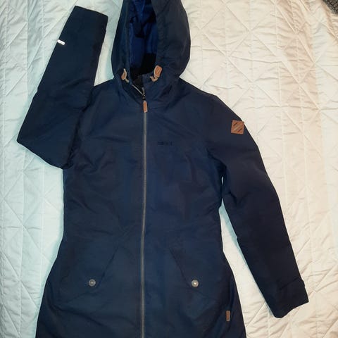 Siisti kuntoinen takki leudommille keleille. Hihassa ja selässä tuollainen heijastintarra