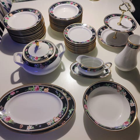 Sisältää n. 40 osaa: lautasia (isot, syvät, alkupalat), tarjoilukulhoja, kastikekulhon ja kannellisen tarjoiluastian.