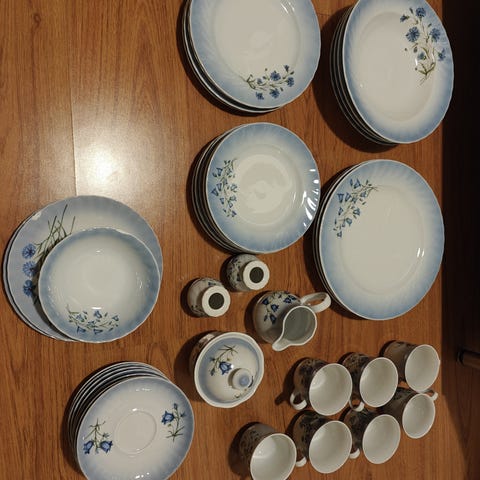 Myydään kaunis Christineholm Porcelaine -astiasto, vaaleansininen kukkakoriste.