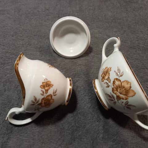 Arabia sokerikko Myrna, jossa on valkoinen posliinipinta ja kultaiset koristeet. Sokerikossa on kansi ja kahvat, ja se sopii esimerkiksi pöydän kattaukseen.
