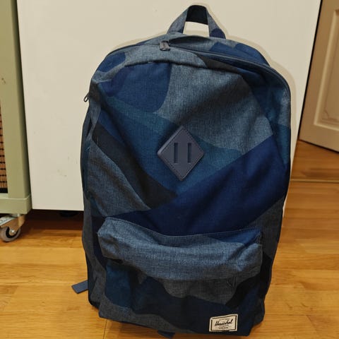 Herschel reppu, väriltään vihreä, ja pieni musta olkalaukku.
