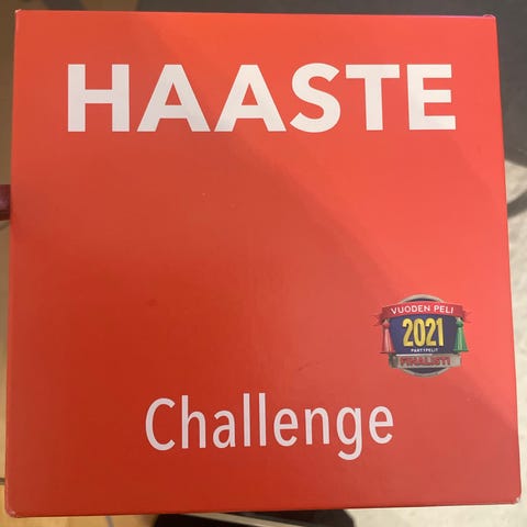Haaste Challenge on lautapeli, jossa pelaajat suorittavat erilaisia haasteita. Peli sisältää kortteja ja ohjeet, ja se sopii 10-vuotiaille ja sitä vanhemmille pelaajille. Pelin kesto on noin 30-60 minuuttia, ja se on tarkoitettu 2-8 pelaajalle.