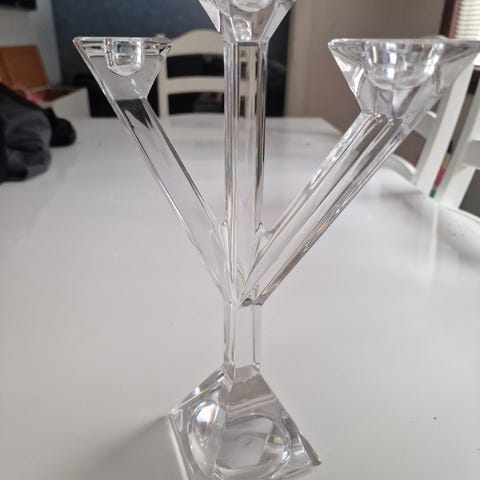 2 haarainen kristalli kynttilänjalka. Tarra kärsinyt, mutta muuten hyvässä kunnossa