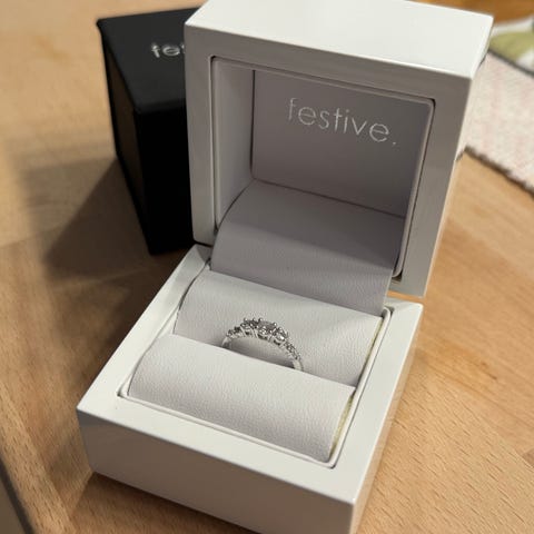 Festive ”Peruskallio” 14 karaatin valkokultainen sormus viidellä pienellä briljanttihiotuilla timantilla.