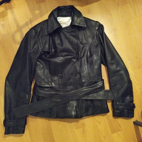 Näyttävä musta nahkatakki (keinonahkaa) ihanalla vaalean punaisella turkiskauluksella. Turkiksen voi irrottaa, sen kiinnitys on napeilla. Takin mittoja: Kai-kai on 43 cm, hartia-helma on 53 cm, takaosan pituus on 48,5 cm, hartia-hihanmpituus on 60 cm. Takin koko on 38.