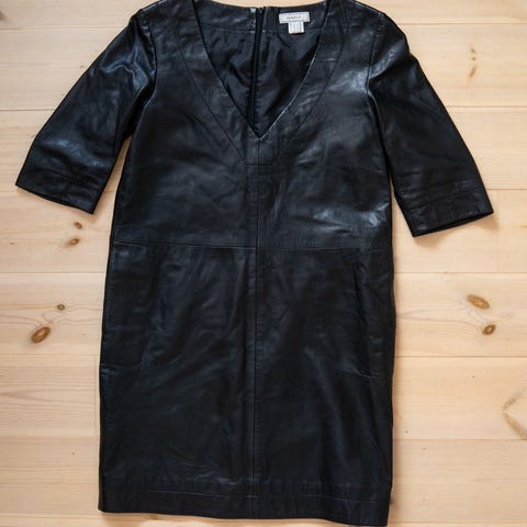 Uusi nahkamekko, pehmeä musta aito nahka, takana vetoketju. Ovh.150-,.