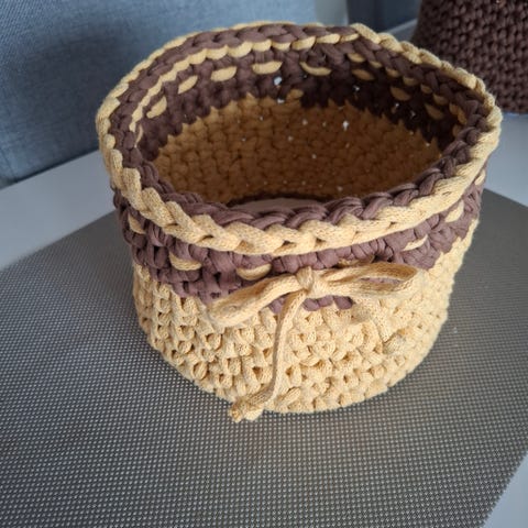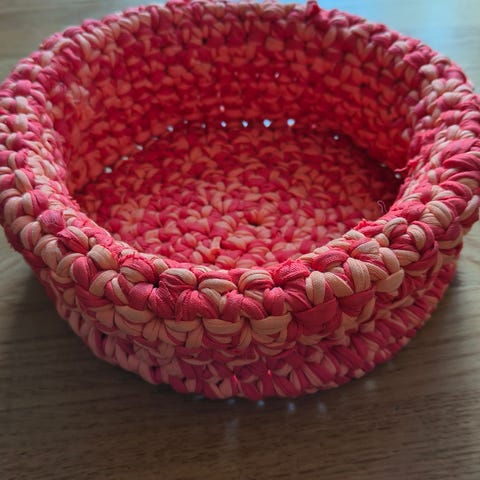 Uusi Virkattu kori Trikookuteesta. Korissa on vaneri pohja. Halkaisija 18cm ja Korkeus 14cm.