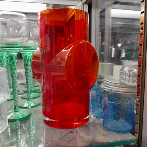 Riihimäen Lasi, Pablo Maljakko, punainen. Erkkitapio Siiroisen Riihimäen Lasille suunnittelema upea Pablo-maljakko 1970-luvulta, haluttu punainen väri. Korkeutta maljakolla on 20 cm.