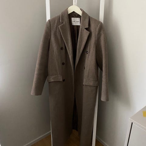 Samsøe Samsøe pitkä villakangastakki naisten koko S, ruskea väri. Takki on valmistettu villasta ja siinä on vyö vyötäröllä. Sopii viileämpiin säihin ja tarjoaa lämpöä ja pehmeyttä.