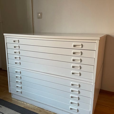 Arkkitehtikaappi karttojen, piirustusten tms säilyttämiseen. Irrotettavat laatikot ja kansi, joten keventävät liikuttelua.