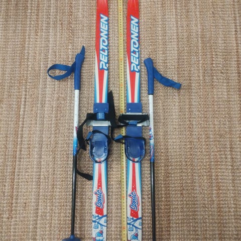 Peltonen Classic hiihtosukset taaperolle (1-4 v), pituus 100 cm. Mukana samanmittaiselle menijälle sopivat Peltosen sauvat ja talvikenkiin sidottavat siteet.