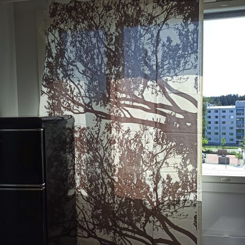 Marimekon Louhi kankaasta verho, pituus 260cm. Verho paksua puuvillaa, hienot värit.