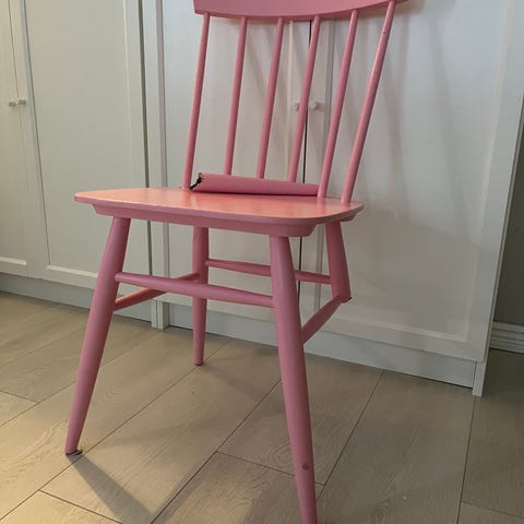 Annetaan kunnostettavaksi valkoinen pinnatuoli. Maalipinta on useasta paikasta kulunut ja jalat vaativat liimauksen.