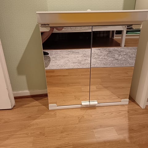 Peilikaappi, jossa on kaksi peiliovea, valaisin yläosassa ja irrotettava hylly. Sopii esimerkiksi kylpyhuoneeseen tai muuhun tilaan, jossa tarvitaan peili- ja säilytysratkaisua.