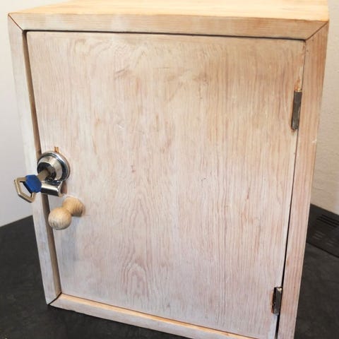 Puinen pieni kaappi. Sisällä olevan ristikon saa pois. Voi myös laittaa pelkän keskitason. Ovi liitutaulua. Nouto.