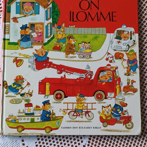 Richard Scarry: Valintamyymälän arvoitus- kirja lapsille. Runsas kuvitus ja lyhyet tekstit.