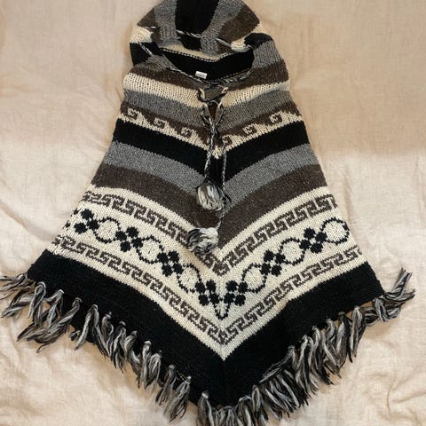 Valkoinen uusi vikainen poncho. Etu ja taka puolessa langassa sävyero.