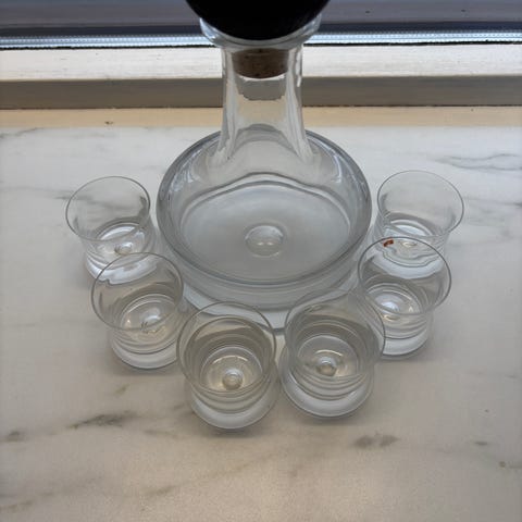 Tämä erittäin siro ja hyvin ohutta lasia oleva karahvi on ollut tuotannossa vain vuosina 1962-64. Sävy hento savun harmaa.