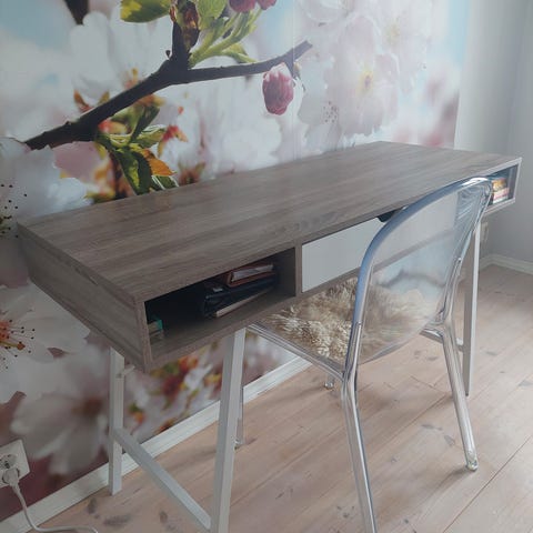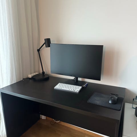 Ikealainen perussiisti työpöytä, pari pientä kolhua kannessa, yleisilme kuitenkin tosi siisti. Jalkojen korkeutta voi säätää paljon, alin korkeus kannen kanssa jopa alle 60 cm, korkeimmillaan reilut 20 cm korkeampi.