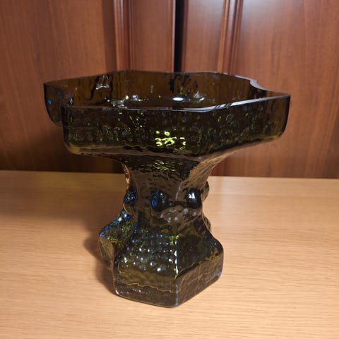 Fenomena on ollut tuotannossa 1968-72 ja ilmentää aikaansa niin muotoilun kuin värinsä puolesta upeasti. Sammaleen vihreä maljakko on kunnoltaan moitteeton.
