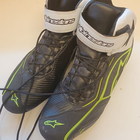 ajokengät mustaa väriä, suunniteltu moottoriurheiluun. Kengissä on nilkkatuki, tarrakiinnitys ja nyöritys. Materiaalina kestävä ja hengittävä kangas ja synteettiset materiaalit. Kengät tarjoavat suojaa ja mukavuutta ajon aikana. Käytetty kerran.