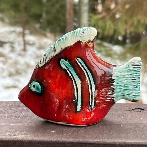 Myydään keraaminen, vihreä ja vanha kala-seinäkoriste. Lienee hauki. Kala on kaikinpuolin hyväkuntoinen, siisti ja ehjä. Kalan pituus on 27 cm ja leveys on evästä evään 12 cm. Kalan päällipinta on lasitettu. Kalan takapuolella on ripustusvalmius seinällä.