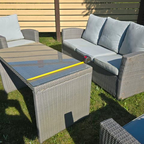 Myynnissä muuton takia sohva, 2 tuolia ja pöytä. Ne ovat noin 4 vuotta vanhat ja vähän käytetty. Ollut parvekkeella turvassa lumelta ja sateelta. Käy myös ulkokäyttöön.