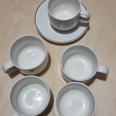 Milja- kahvikuppi aluslautasineen, suunnittelija Ulla Procope. Kaksi uuden veroista ehjää ja siistiä kuppiparia. Yhteishinta. Maksu käteisellä tai Mobilepaylla.