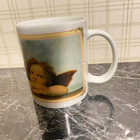 Mukissa on vaaleansininen/turkoosi pohjaväri ja kuvituksena kolme kruunupäistä keijua / prinsessaa / enkeliä