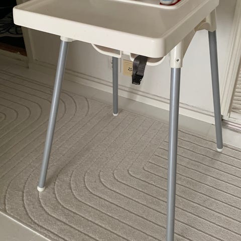 Juuri kunnostettu Brio syöttötuoli. Muoviosat pesty, puuosat maalattu ja istuinosa verhoiltu. Istuinkorkeus 58cm.