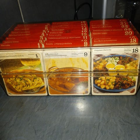 1970- ja 1980-luvuilla erittäin suosittuja, postitse kotiin tilattavia reseptikorttipaketteja, jotka sisälsivät kotikeittiöön soveltuvia reseptejä. Kortit siististi muovikotelossa.