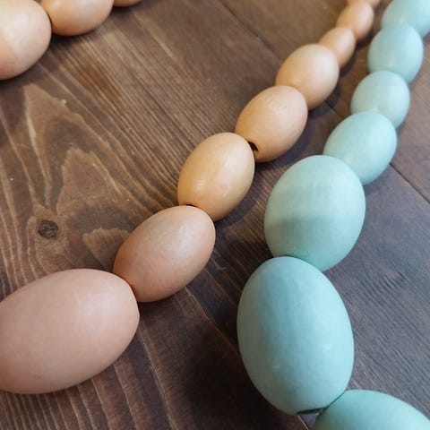 Viisi pitkää puuhelmistä tehtyä kaulakorua. Nämä yltää tarvittaessa kietoa kaulaan myös kaksinkerroin. Osa on tuliaisia Afrikasta, osa ostettu Etelä-Euroopasta.