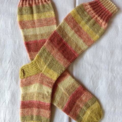 Koko noin 38 - 39, lavan pit. 24,5 cm varren pit. kantapäästä alkaen 4,5 cm. Neulottu 7 veljestä langasta, 75 % villaa + 25 % polyamidia. Hieno-/villapesu 40 astetta.