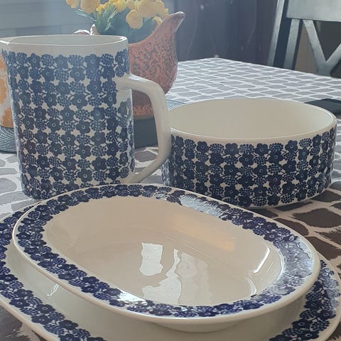 Myydään Arabia Rypäle,sinikukkaiset matalat ruokalautaset.